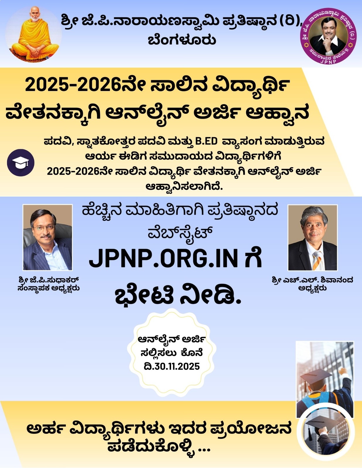 ಶ್ರೀ ಜೆ.ಪಿ. ನಾರಾಯಣಸ್ವಾಮಿ ಪ್ರತಿಷ್ಠಾನದ *ವಿದ್ಯಾರ್ಥಿ ವೇತನ ಹಾಗೂ ಇತರೆ ಮಾಹಿತಿಗಾಗಿ* ದಯವಿಟ್ಟು ಕೆಳಗಿನ ಸಂಖ್ಯೆಯನ್ನು ಸಂಪರ್ಕಿಸಿ: